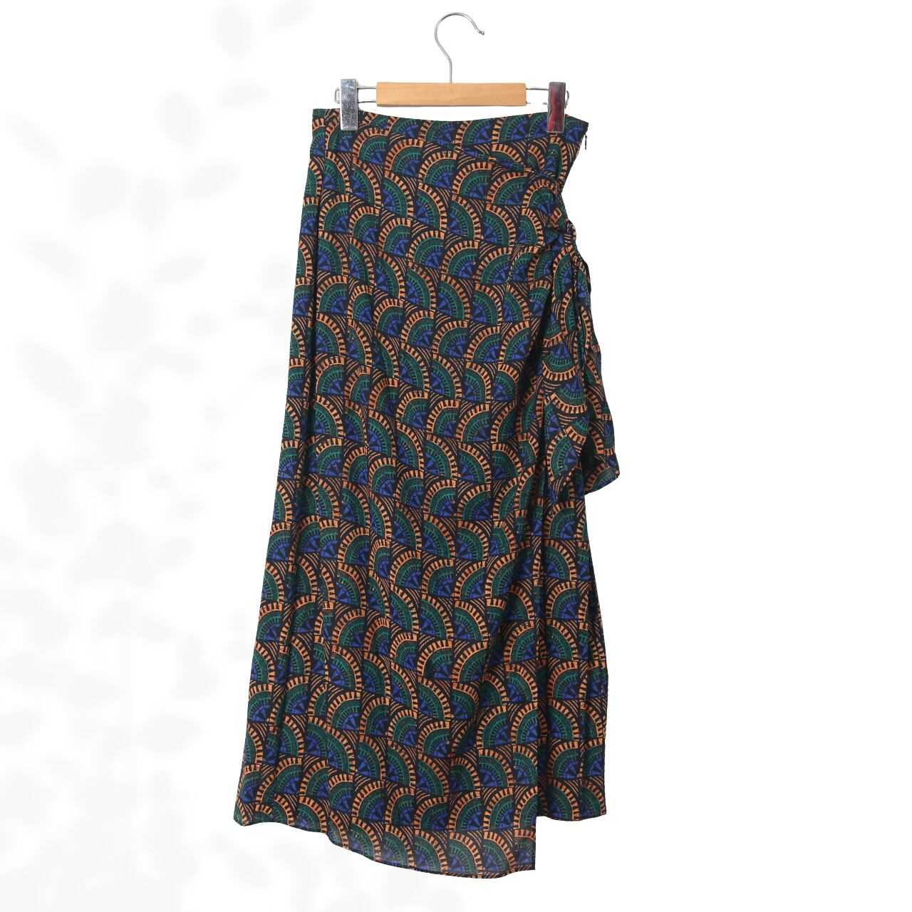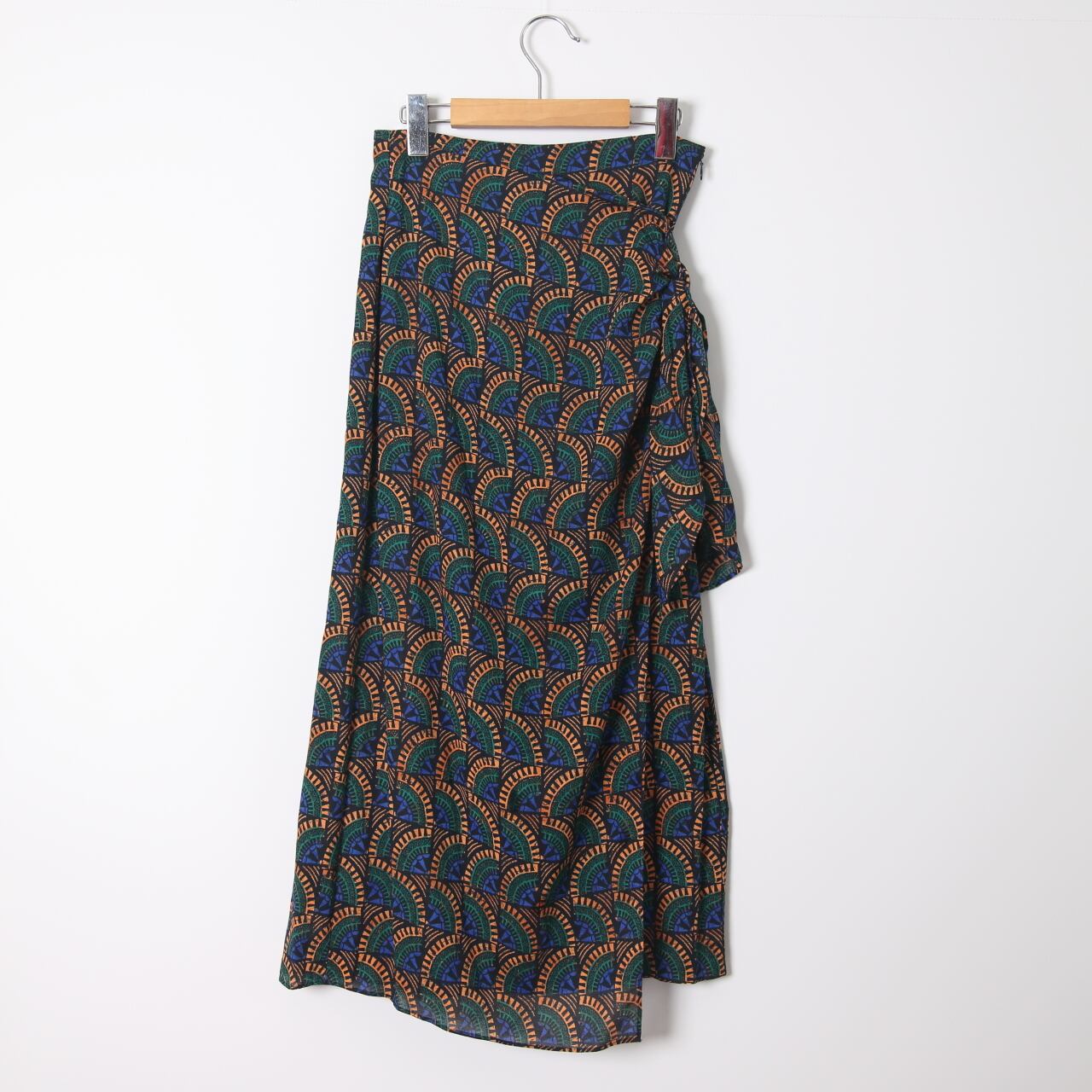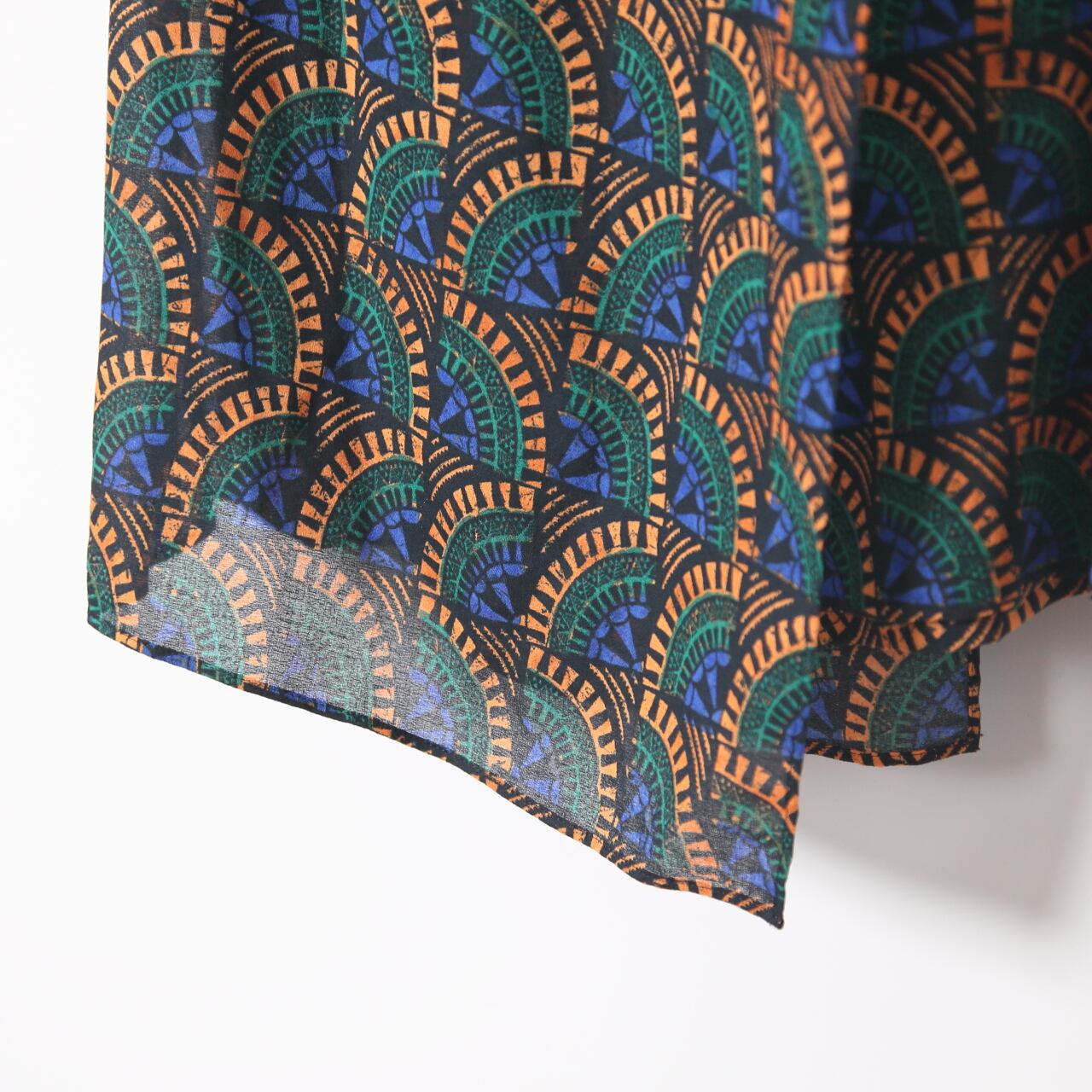 アフリカンテイストの幾何学模様が印象的な存在感のあるラップスカートです。