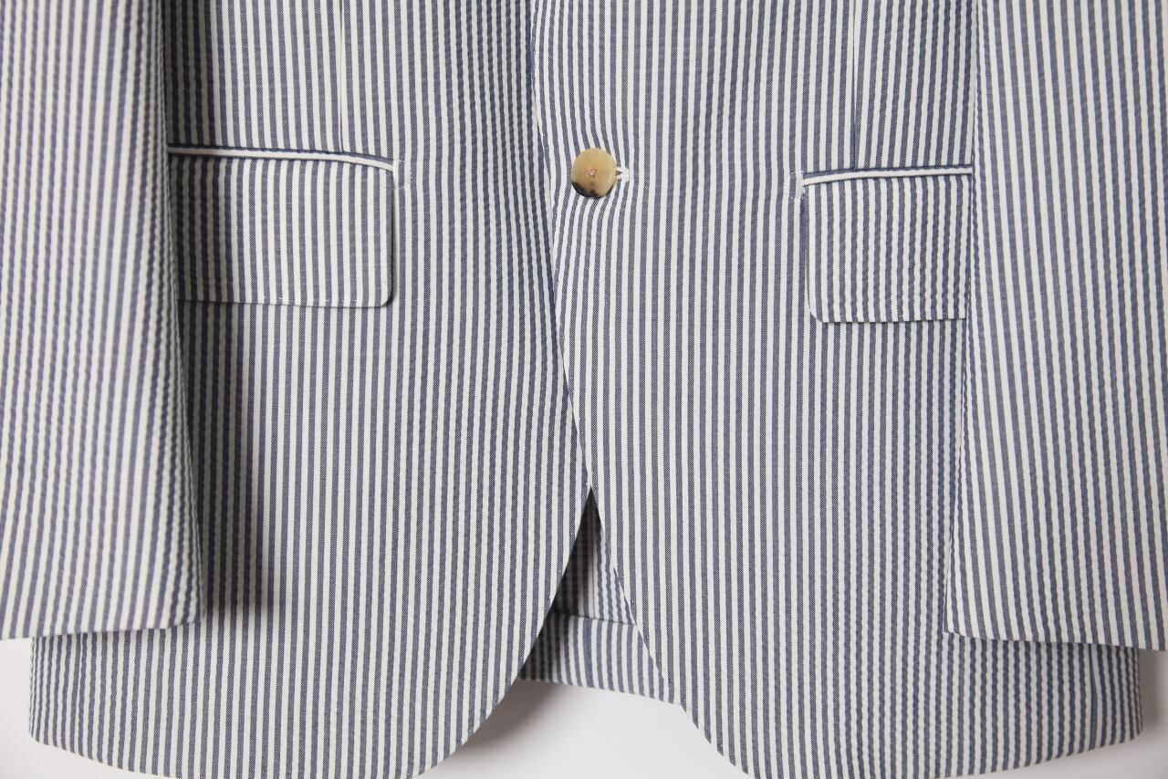 ウールに麻やポリエステル、ポリウレタンなどを混紡した生地で、コットンのような風合いやシアサッカーのような凹凸感が特徴、高いストレッチ性をもち、通気性がよく快適に着ていただけます。