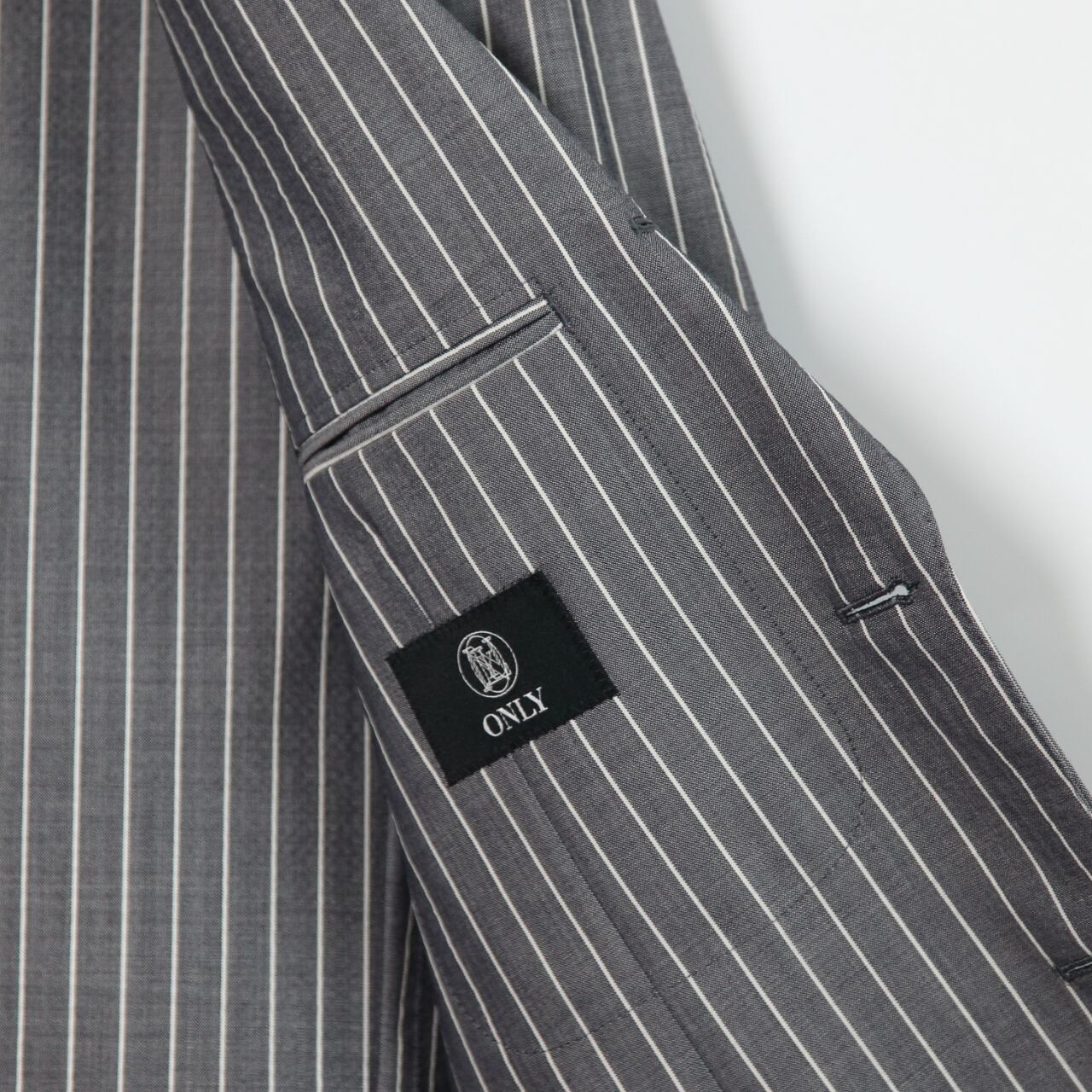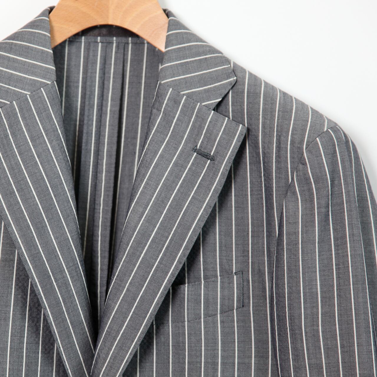 グレーにホワイトのストライプが映える、イタリアならではの美しい発色。表面には豊かな凹凸感があり、光の当たり方で表情が変わる、非常に奥行きのある生地です。